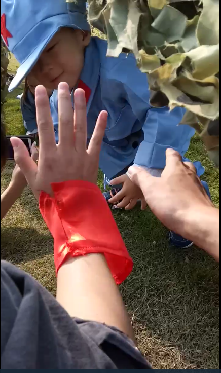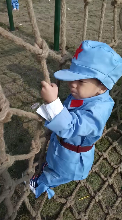 今天陪儿子一起去参加了幼儿园第一次的亲子游,换上了小八路的衣服,虽然衣服不是很合身,但是穿好之后依然帅帅的,拿着手机不听的拍照。先来2张靓照: