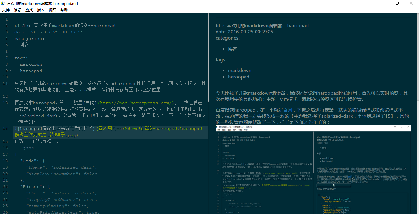 百度搜索haroopad,第一个就是官网,下载之后进行安装,默认的编辑器样式和预览样式不一致,强迫症的我一定要修改成一致的【主题我选择了solarized-dark,字体我选择了15】,其他的一些设置也随便修改了一下,样子是下面这个样子的: